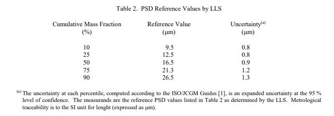 NIST SRM 1985 碳化鎢/鈷(標(biāo)準(zhǔn)品)LLS 的參考 PSD 值列在表 2 中。參考值是未經(jīng)認(rèn)證的值,是對(duì)真實(shí)值的估計(jì)。但是,這些值不符合 NIST 認(rèn)證標(biāo)準(zhǔn),并且提供了相關(guān)的不確定性,可能僅反映測(cè)量精度,可能不包括所有來(lái)源不確定性,或可能反映多種分析方法之間缺乏足夠的統(tǒng)計(jì)一致性 [1]。