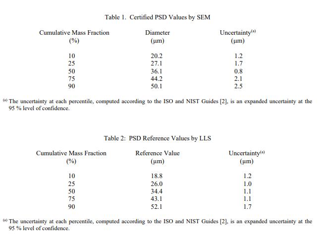 經(jīng) SEM 認(rèn)證的 PSD 值列于表 1。這些認(rèn)證值是通過(guò)測(cè)量來(lái)自三個(gè)瓶子的 11 000 多個(gè)單個(gè)顆粒而確定的。 NIST 認(rèn)證值是 NIST 對(duì)其準(zhǔn)確性具有最高置信度的值,因?yàn)樗幸阎蚩梢傻钠顏?lái)源都已被調(diào)查或考慮在內(nèi) [1]。