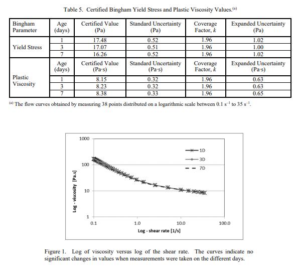 NIST 認證值是 NIST 對其準確性有最高置信度的值,并且所有已知或可疑的偏差來源都已調查或考慮在內 [1]。經認證的 Bingham 屈服應力和塑性粘度值在表 1 中給出,并且是基于在 NIST 由單個操作員使用平行鋸齒板流變儀進行的分析測量結果。粘度與剪切的完整曲線
