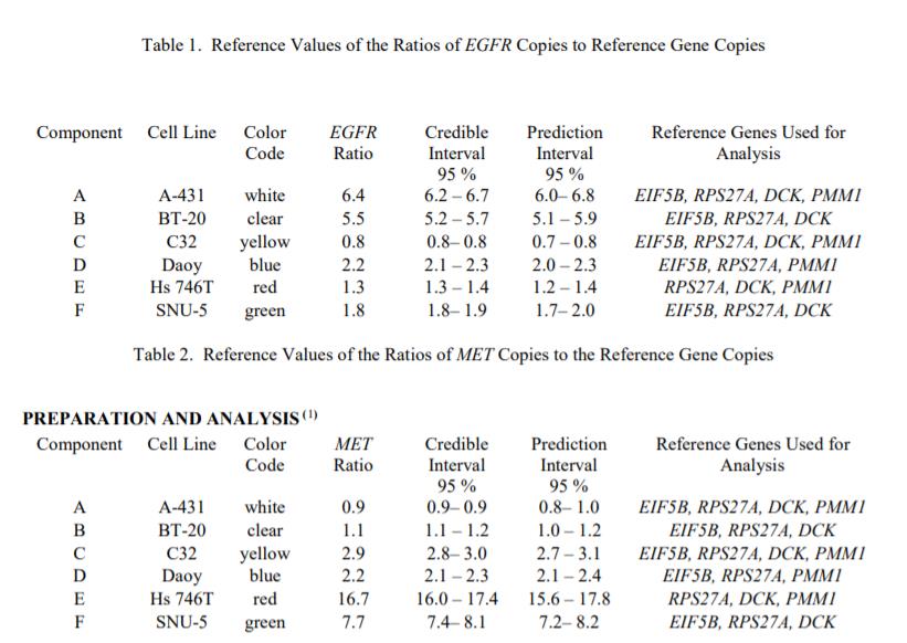 NIST RM 8366 EGFR和MET 基因拷貝數(shù)標(biāo)準(zhǔn)每個參考基因的 EGFR 和 MET 拷貝的參考比率與 95% 可信區(qū)間和 95% 預(yù)測區(qū)間顯示在表 1 和表 2 中。NIST 參考值是 NIST 證書上提供的真實值的最佳估計, NIST [3] 未對所有已知或可疑的偏倚來源進(jìn)行全面調(diào)查的分析證書或調(diào)查報告。