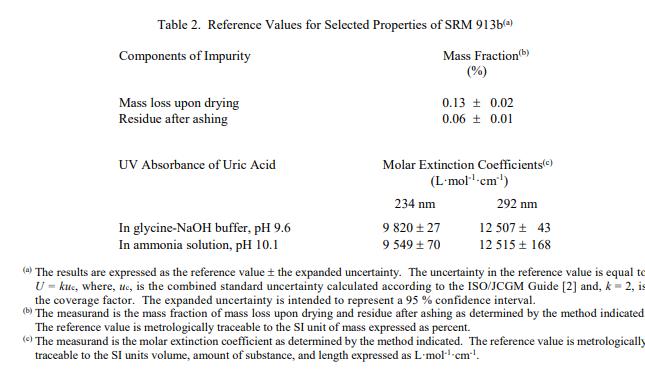 血清尿酸標準物質SRM 913b中的尿酸:尿酸是臨床診斷腎病的重要檢驗指標之 一,臨床常用的尿酸檢測方法有酶法、電化 學法、磷鎢酸還原法、毛細管電泳法、液相 色譜法等。為了提高檢測結果間的可比性和準確性,提供具有準確量值的尿酸標準物質,在臨床 上有重要意義。
